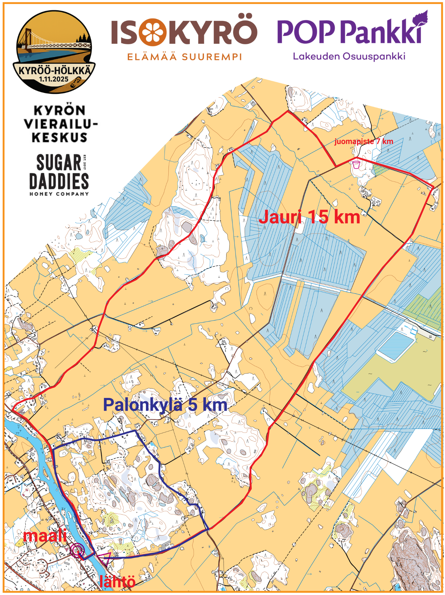 Lähtö sijaitsee Jaurintien päässä. Maali sijaitsee kilpailukeskuksessa, Kyrön Vierailukeskuksen pihassa.